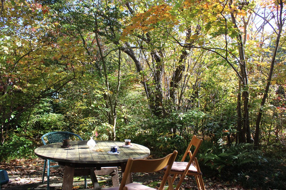 澄んだ青空と紅葉の中でゆっくりと珈琲を飲み